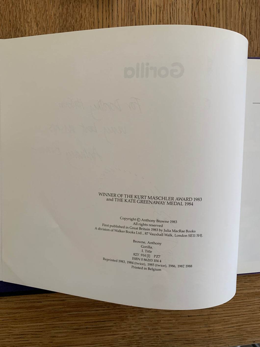 ‘Gorilla’ written and illustrated by Anthony Browne. Published by Julia MacRae Books. 1988. UK reprint edition. Laminated pictorial boards. No dustwrapper as issued.