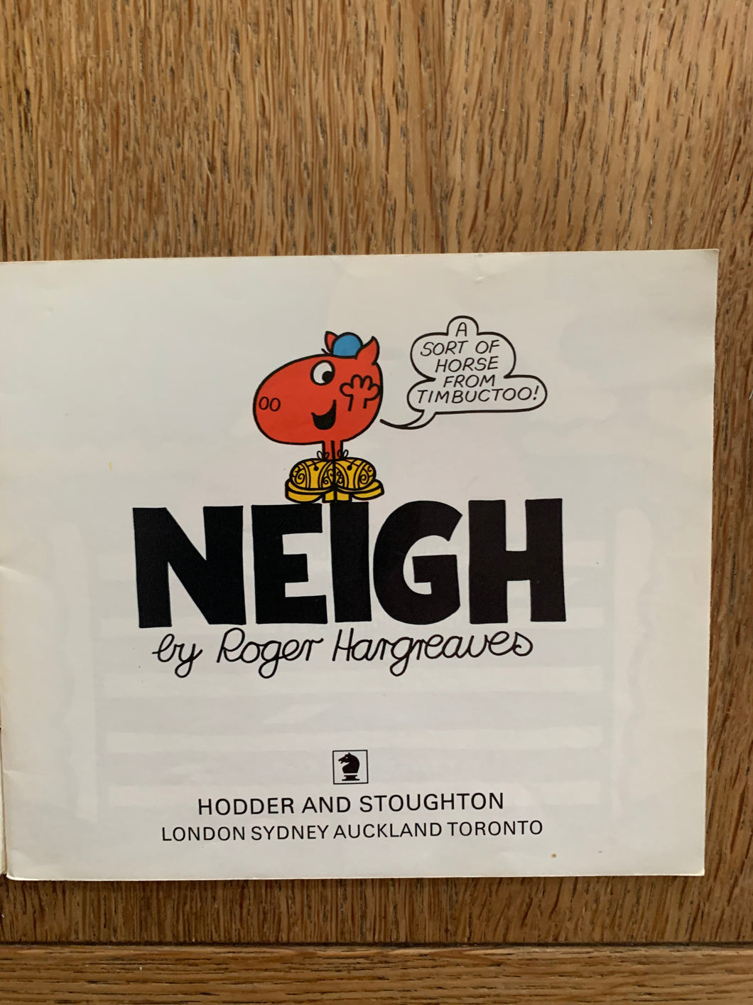 ‘Neigh' by written and illustrated by Roger Hargreaves. Published by Hodder and Stoughton. 1978. UK 1st edition. Card covers. No dust wrapper as issued. Small format.