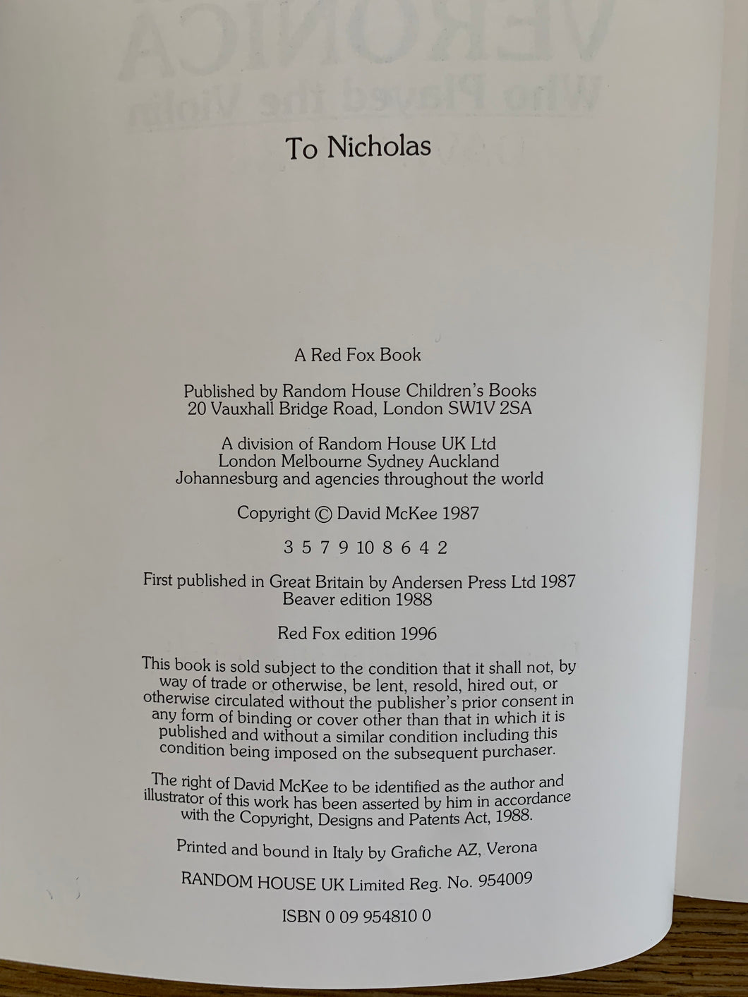 ‘The Sad Story of Veronica Who Played the Violin' written and illustrated by David McKee. Published by Random House. Red Fox edition 1996. Card covers.