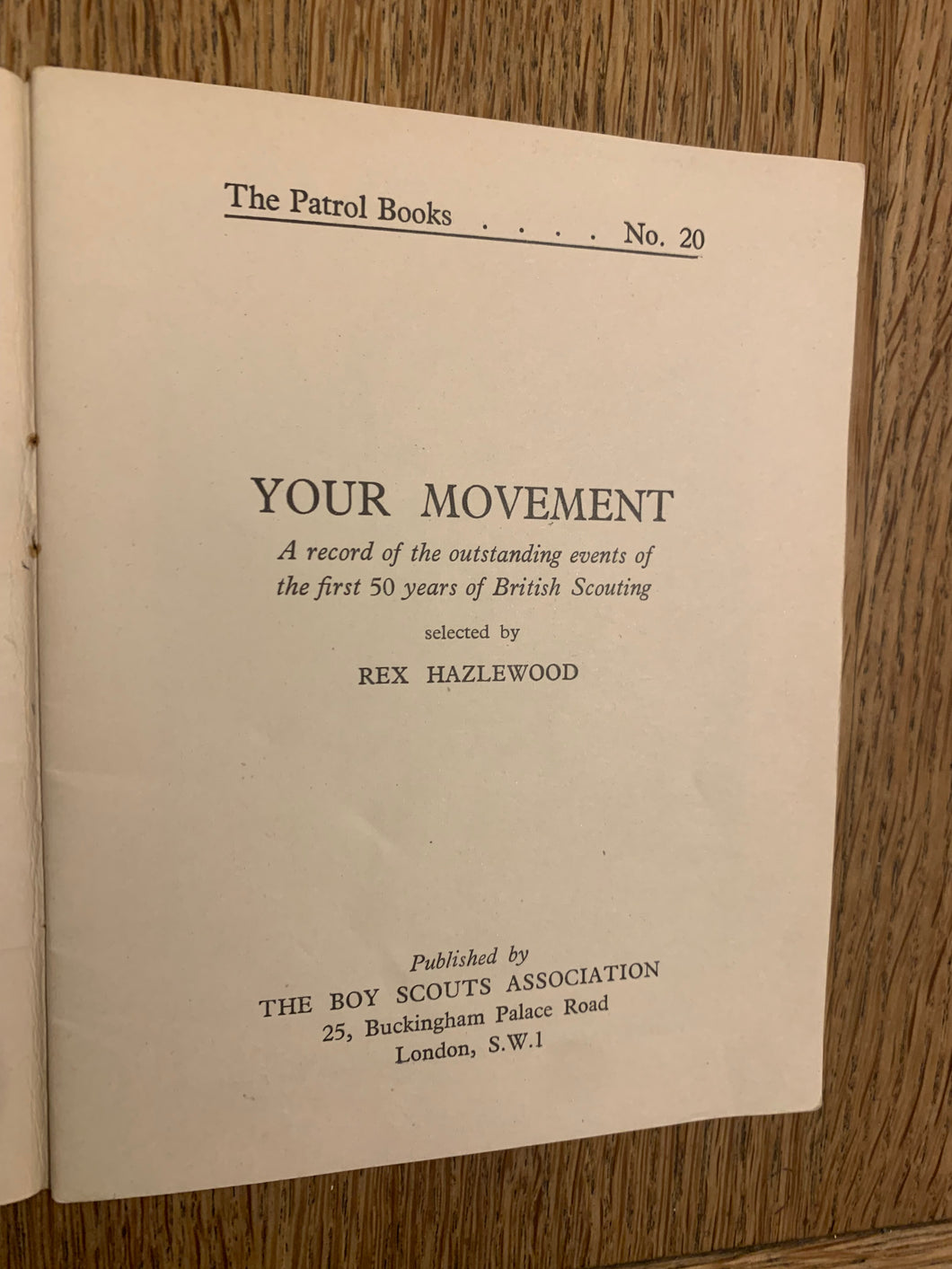 ‘Your Movement - A Record of the Outstanding Events of the First 50 Years of British Scouting’ selected by Rex Hazlewood. Published by The Boy Scouts Association. 1956. UK 1st edition. Card covers with no dustwrapper as issued. 32pp.