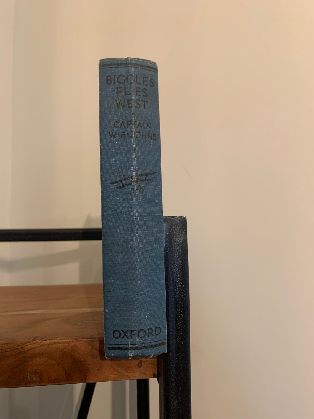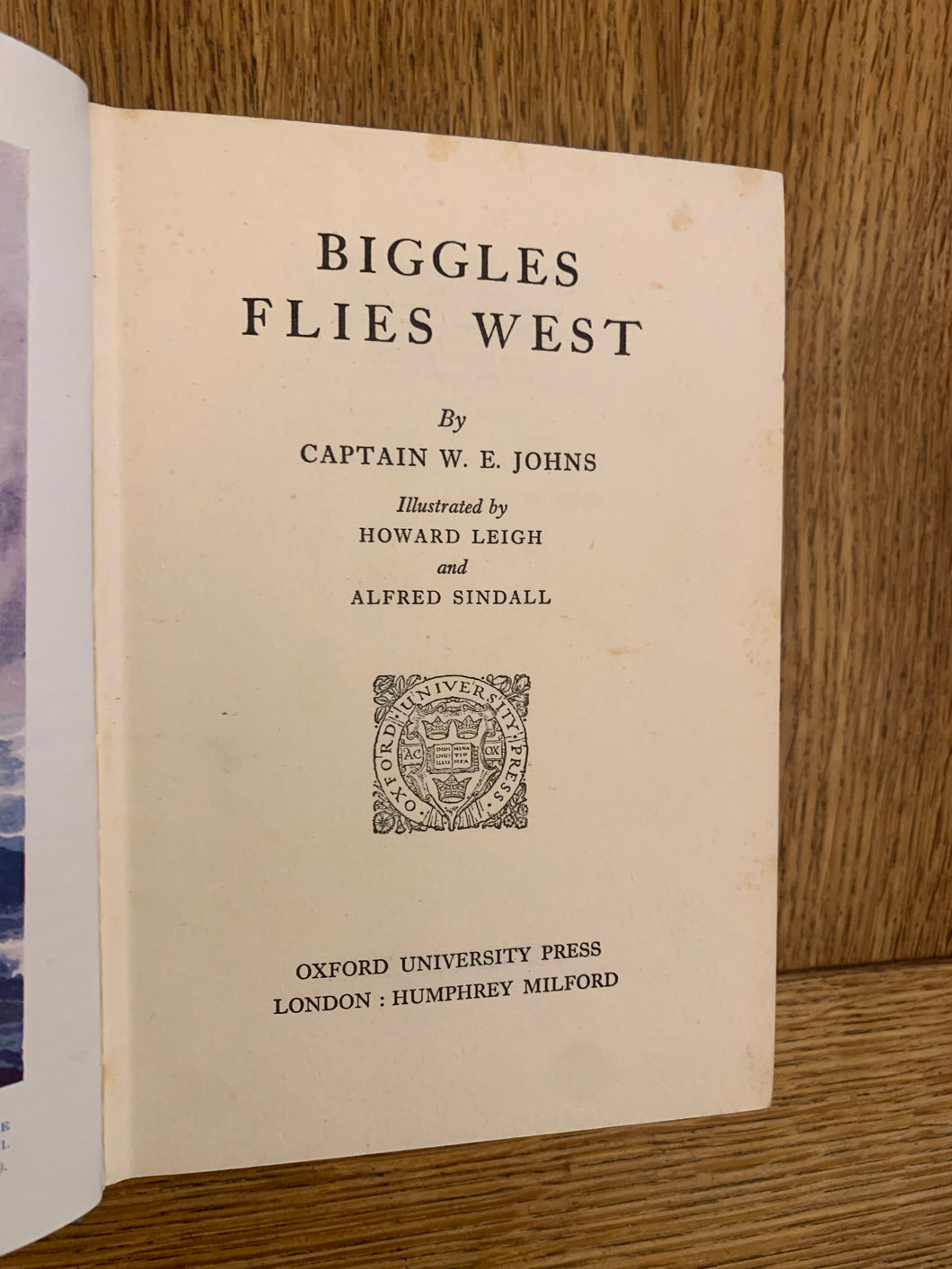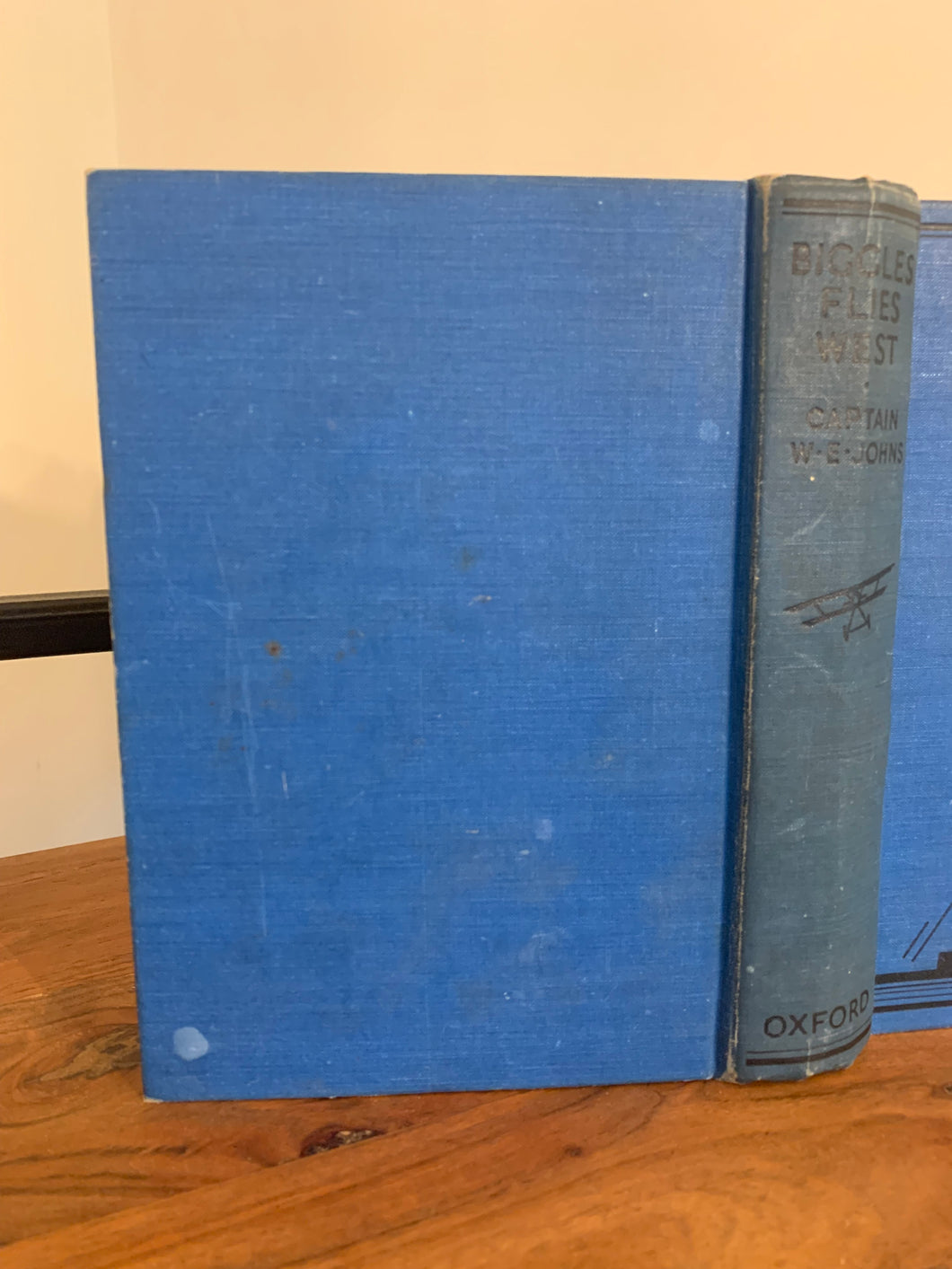 ‘Biggles Flies West’ by Captain W.E. Johns. Illustrated by Howard Leigh and Alfred Sindall. Published by OUP. Undated (1937) UK 'Pyramid' edition. Blue boards with black decoration. No dust wrapper.