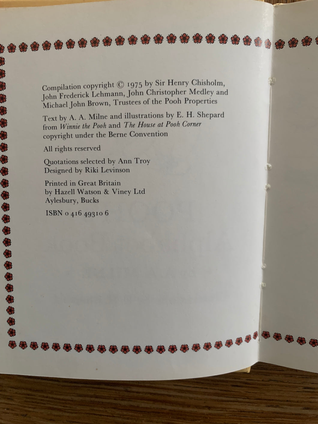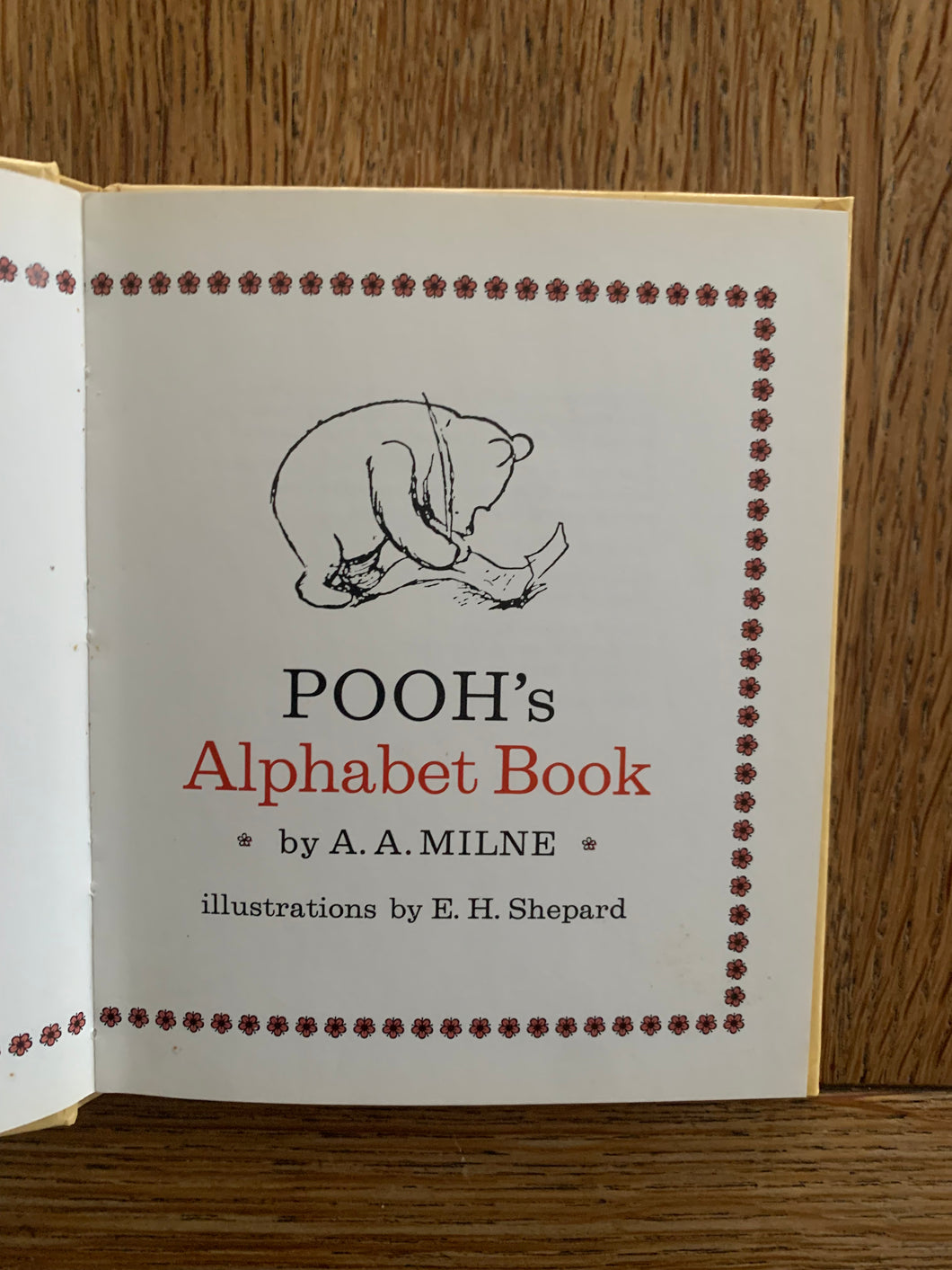 'Pooh's Alphabet Book' by A.A.Milne, illustrated by E.H.Shepard. Published by Methuen. 1975. UK 1st edition. Laminated pictorial boards with no dust wrapper as issued.