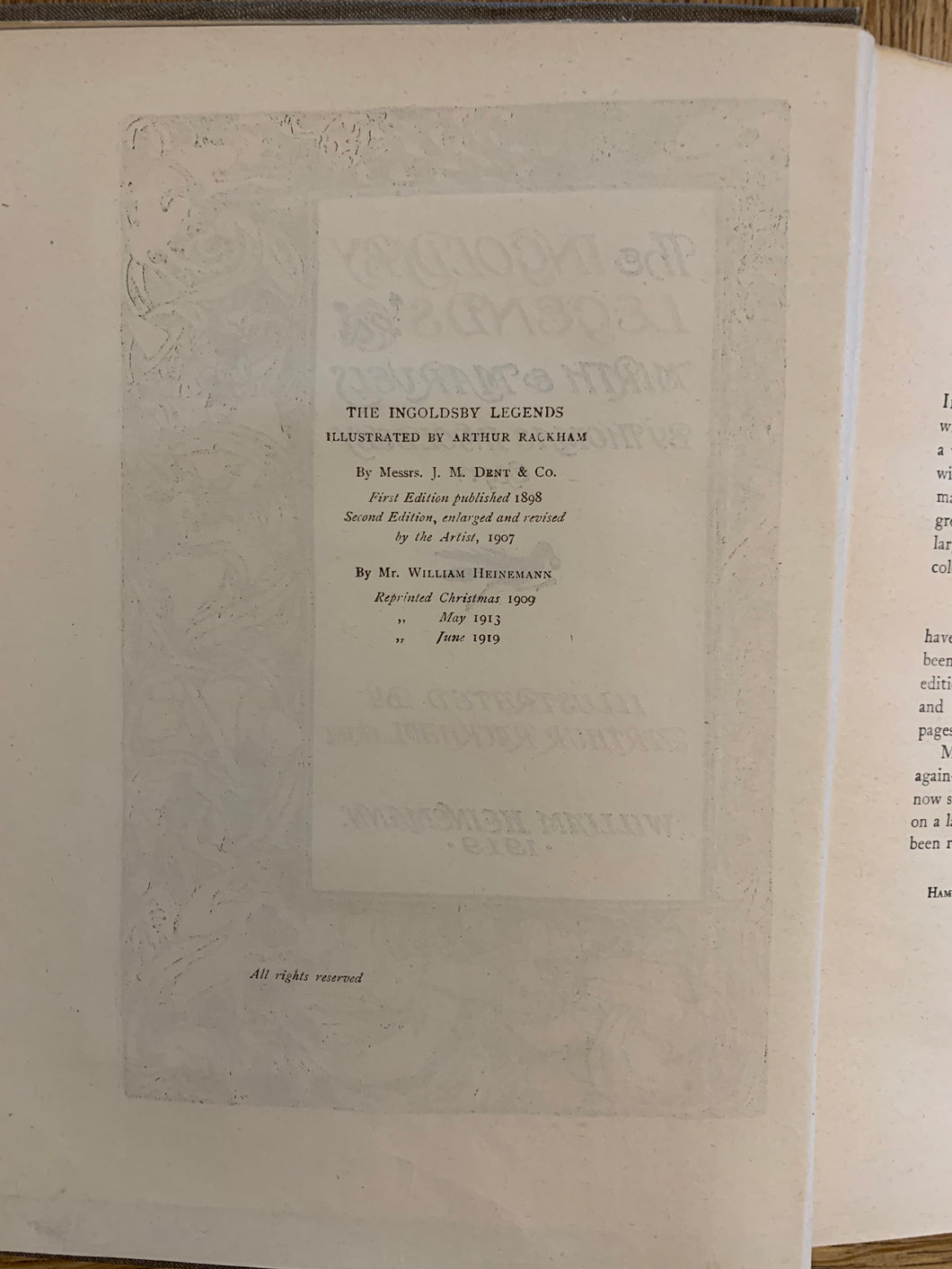 'The Ingoldsby Legends of Mirth and Marvels' by Thomas Ingoldsby. Illiustrated by Arthur Rackham. Published by Heinemann. June 1919. UK reprint edition. Decortaed boards with no dust wrapper.