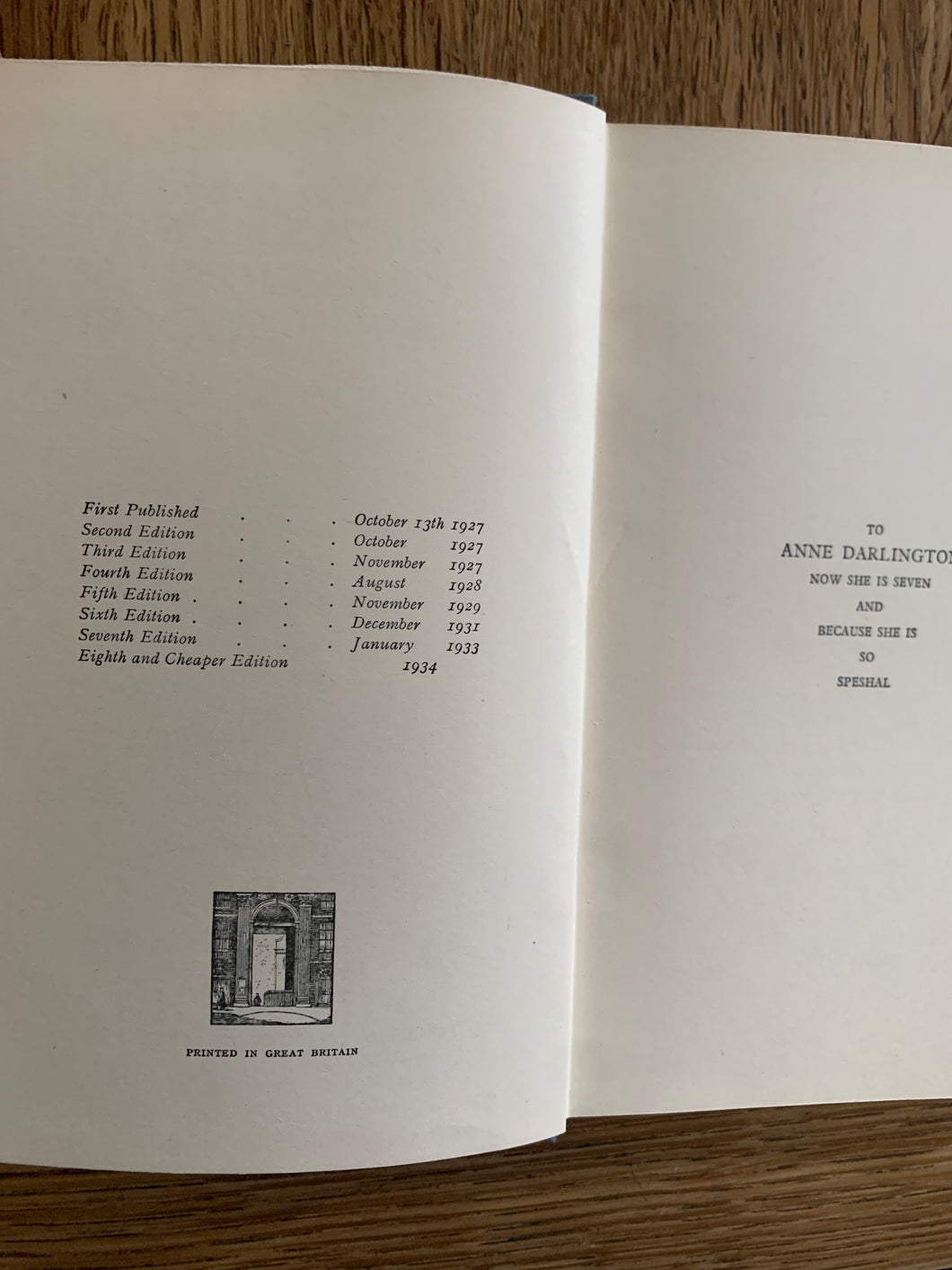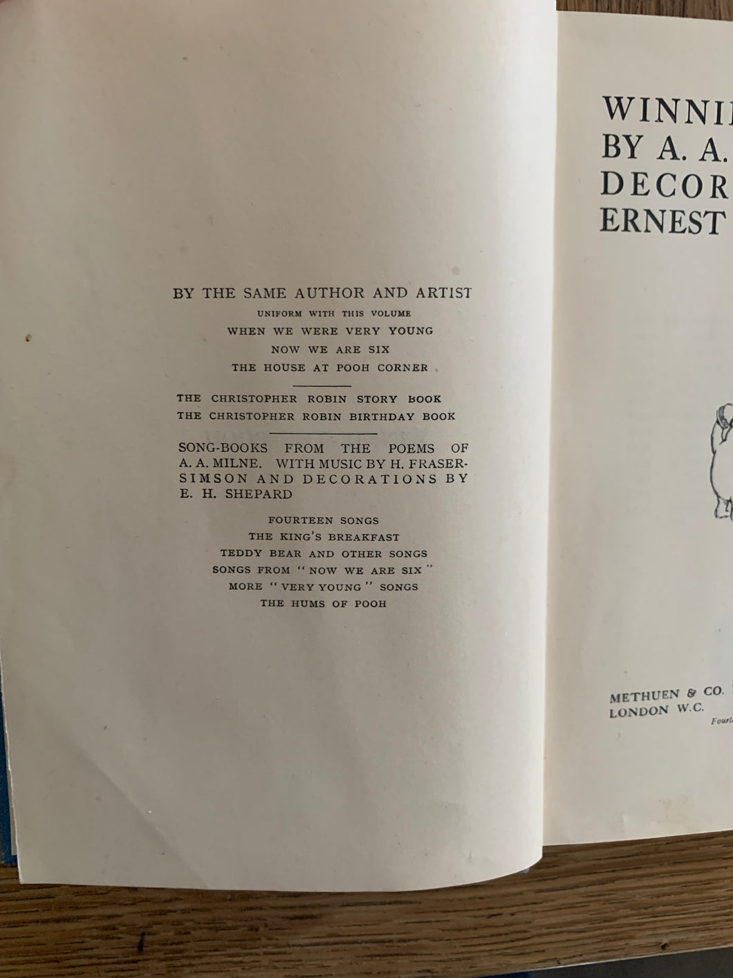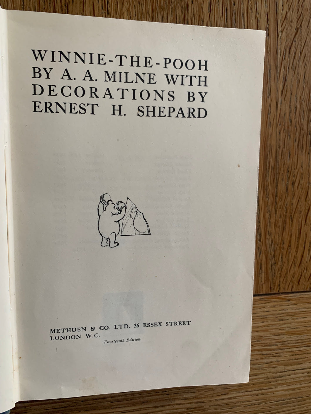 ’Winnie-the-Pooh' published by Methuen. 1934. 14th edition. The book is in very good condition with a single name written on the fep, which together with the first few pages has a crease and occasional foxing. The spine has a slight lean, sunning to the base, and bumping to the corners. The dust wrapper is in very good condition, with very light wear to the top/base of the spine, which is lightly sunned, and the corners. The wrapper is not price clipped, and comes in a clear unattached protective cover.